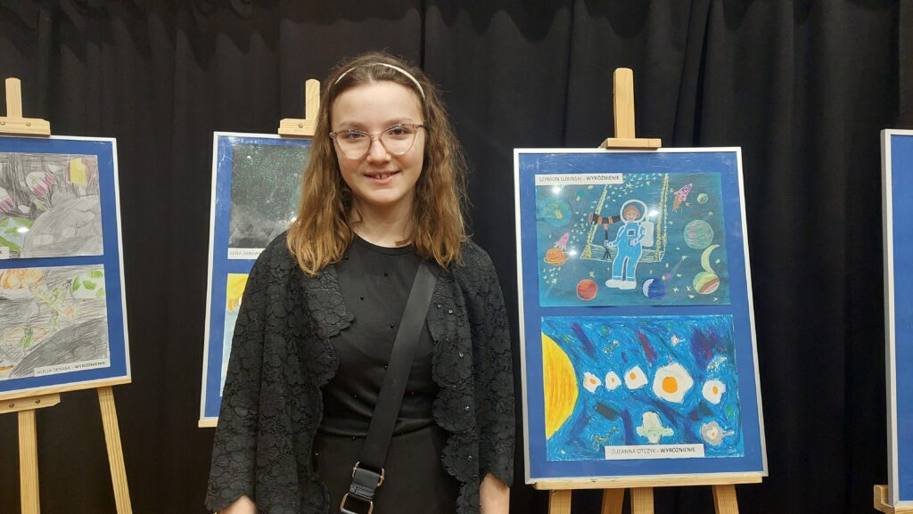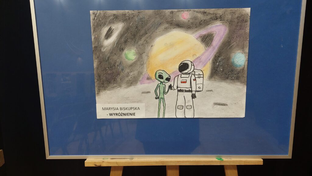 Do konkursu zgłoszono kilkaset prac – barwnych, fantazyjnych i tak kreatywnych, że jury musiało odbyć prawdziwą międzygwiezdną naradę, by wybrać te najjaśniej świecące. Nagrodzone dzieła zachwycały precyzją, eksplozją kolorów i kosmicznym klimatem, w którym można było niemal usłyszeć szum gwiazd. Na uroczystość wręczenia nagród przybyli młodzi artyści wraz ze swoimi rodzinami, opiekunami i wiernymi fanami. W sali MOK-u panowała atmosfera wielkiej artystycznej wyprawy – każdy mógł poczuć się jak odkrywca zupełnie nowej galaktyki. Temat konkursu plastycznego – „Wśród gwiazd i planet” – okazał się idealnym zaproszeniem do twórczej podróży. Twórcy z pełną odwagą i wyobraźnią wyruszyły na orbitę swoich marzeń, tworząc niezwykłe wizje kosmicznych światów. Ich prace były niczym otwarte portale do bajkowych krain, gdzie planety tańczą, komety mrugają, a kolory mają własne życie. Wszystkie nagrodzone i wyróżnione prace można było podziwiać na zorganizowanej wystawie, która mieniła się kolorami i pomysłami niczym nocne niebo.