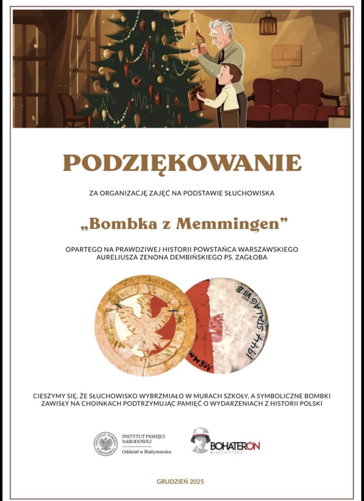 Podczas lekcji historii uczniowie wysłuchali i omówili słuchowisko, a następnie wykonali pamiątkowe bombki będące symbolem pamięci o trudnych wojennych czasach. Zwieńczeniem wykonanego projektu był otrzymany certyfikat dla naszej szkoły.
