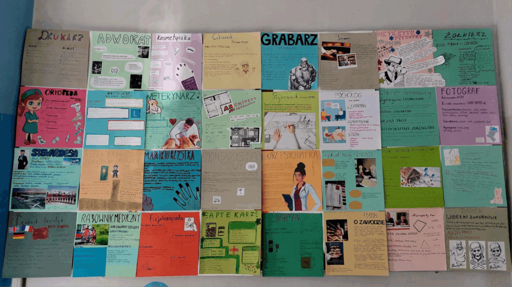 Z okazji Tygodnia Przedsiebiorczości uczniowie klas ósmych przygotowali plakaty zawodoznawcze. Przy tej okazji dowiedzieli się jakie są perspektywy podjęcia pracy i wymagania w danych zawodzie, a także średnie zarobki. Niektórzy, wdrażając informacje na temat wybranego zawodu utwierdzili się w przekonaniu dotyczącym wybranej ścieżki kształcenia, ale byli i tacy którzy zweryfikowali swoje poglądy i wyobrażenia na temat konkretnego zawodu.