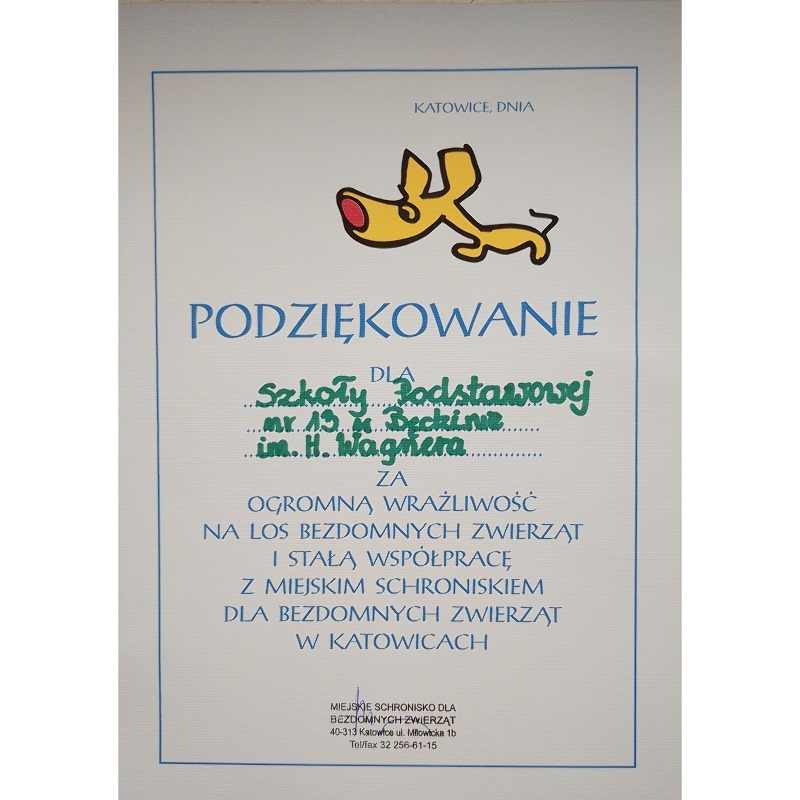 Składam gorące podziękowania każdemu Wolontariuszowi oraz Ich Rodzicom, zwłaszcza chłopcom klasy VIII e , za bezinteresowną pomoc najbardziej potrzebującym, czasem porzuconym czworonogom. Wspólnie dokonaliśmy wielkiej rzeczy, wspierając zwierzaki, które można odwiedzić raz w miesiącu z rodzicem, bądź opiekunem prawnym, by mogły doświadczyć ludzkich serc.