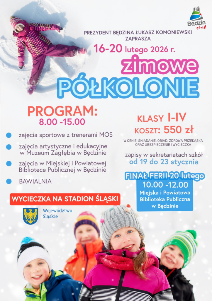 Prezydent Będzina Łukasz Komoniewski zaprasza na Zimowe Półkolonie. Zachęcamy do zapisów w sekretariacie szkoły.